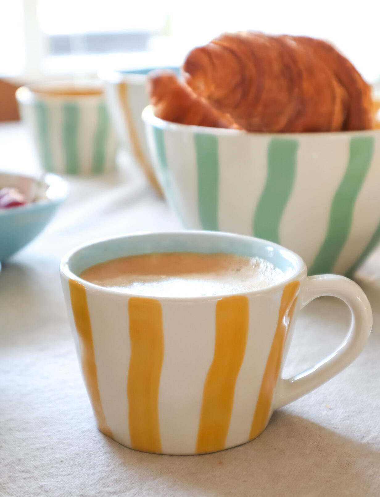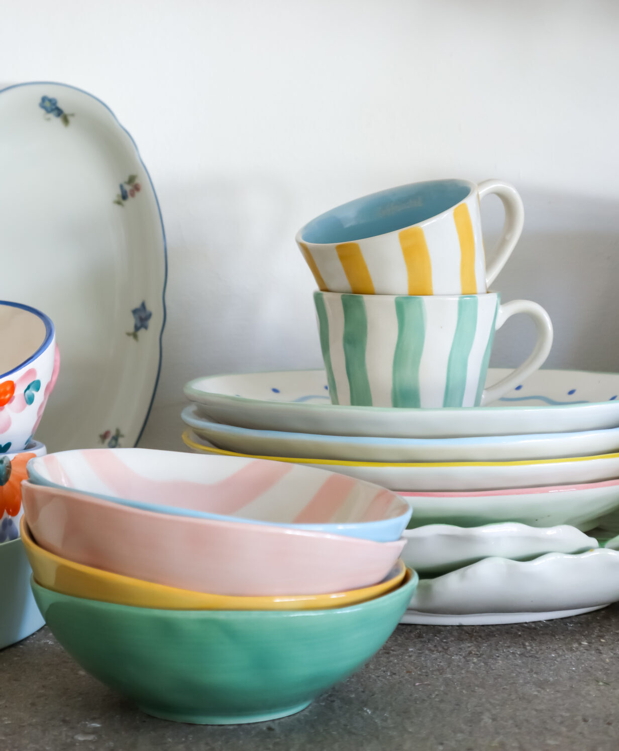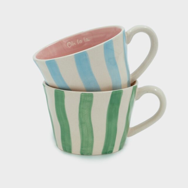 De buitenkant van de mokjes is beschilderd met kleurrijke, golvende lijnen die een speels en levendig effect geven. De binnenkant is met de hand voorzien van een verfijnde draaibeweging in het glazuur, wat zorgt voor een chique en ambachtelijke uitstraling. Bovenin de binnenkant van elk mokje is een subtiele, ingedrukte tekst gedrukt die altijd zichtbaar is, ook wanneer er koffie in het mokje zit. Op het ene mokje staat “caffeinated” en op het andere “cheers love”. Een vrolijke en persoonlijke touch voor elk koffiemoment.