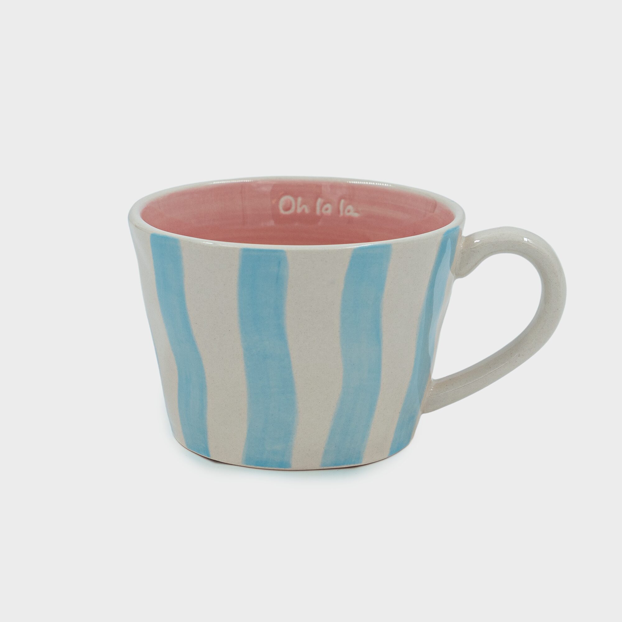 De buitenkant van de mokjes is versierd met kleurrijke, golvende lijnen die zorgen voor een speels en levendig effect. De binnenkant is met de hand afgewerkt met een draaiende beweging in het glazuur, wat een ambachtelijke en chique uitstraling geeft. Bovenin elk mokje is een subtiele, voelbare tekst in het glazuur verwerkt. De ene mok zegt “oh la la”, de andere “glowing”. Een vrolijke en persoonlijke touch voor elk koffiemoment.